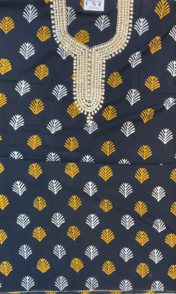 • Top/Kurti Fabric: Pure Cotton with white block print & golden Gotta Patti neck embroidery