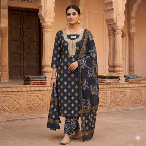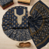 This exquisite 3-piece dress material features a pure cotton kurta fabric in a rich black base, adorned with an all-over white traditional block print motif — lightweight, breathable, and ideal for daily wear as well as festive occasions.